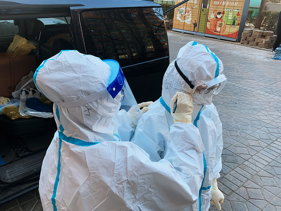 Usually, a COVID-19 test team requires two medical workers. Wang’s partner is 26-year-old Yu Xiaoyi, a doctor who worked in Wang’s hospital for less than a year. Preparing medical equipment together, Wang shared her experience in COVID-19 prevention with Yu, helping young medical professionals better understand the virus.