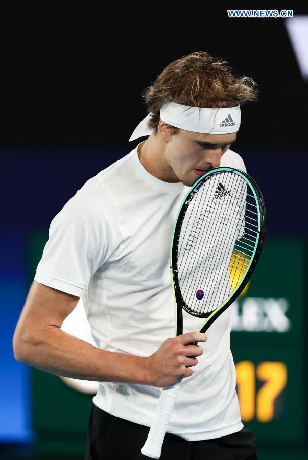 Germany's Alexander Zverev reacts during the ATP Cup group A match between Serbia and Germany in Melbourne, Australia, on Feb. 5, 2021. (Xinhua/Bai Xuefei)