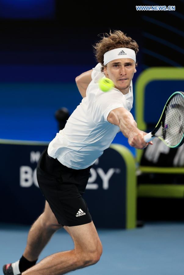 Germany's Alexander Zverev returns the ball against Serbia's Novak Djokovic during the ATP Cup group A match between Serbia and Germany in Melbourne, Australia, on Feb. 5, 2021. (Xinhua/Bai Xuefei)