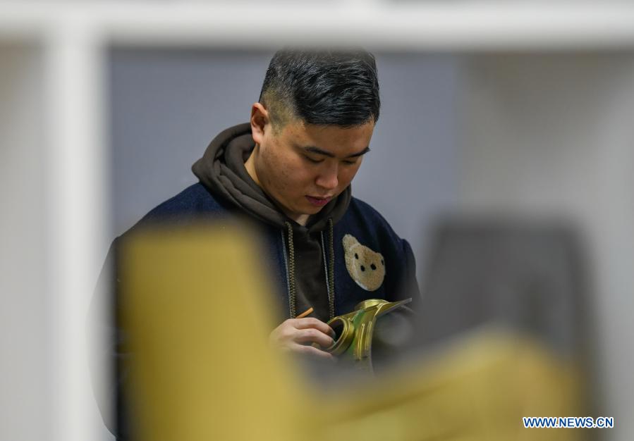 Zeng Zhou views props of a Sanxingdui-themed stage play at a cultural industrial park in Chengdu, southwest China's Sichuan Province, Feb. 4, 2021. Zeng Zhou is a 31-year-old independent designer working on toy figure design. Inspired by a visiting experience at Sanxingdui Museum in Sichuan, Zeng decided to design model figures imitating bronze relics of the Sanxingdui Ruins, which are believed to be remnants of the Shu Kingdom dating back 2,600 years to 4,800 years, blending traditional Chinese culture with fashion toys. Zeng Zhou is now dedicated to optimizing his design and promoting mass production of his toy figures. "I hope more collections of cultural relics of our country could be displayed by means of trendy, stylish designs," Zeng Zhou said. (Xinhua/Wang Xi)