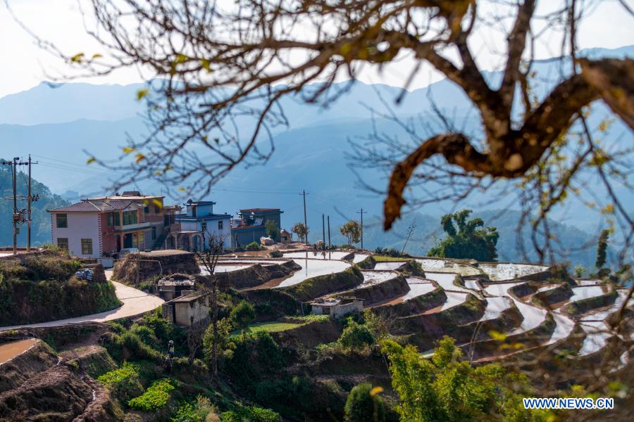 Photo taken Feb. 4, 2021 shows houses and Hani terraced fields in Sancun Township of Honghe County, southwest China's Yunnan Province. (Xinhua/Chen Xinbo)