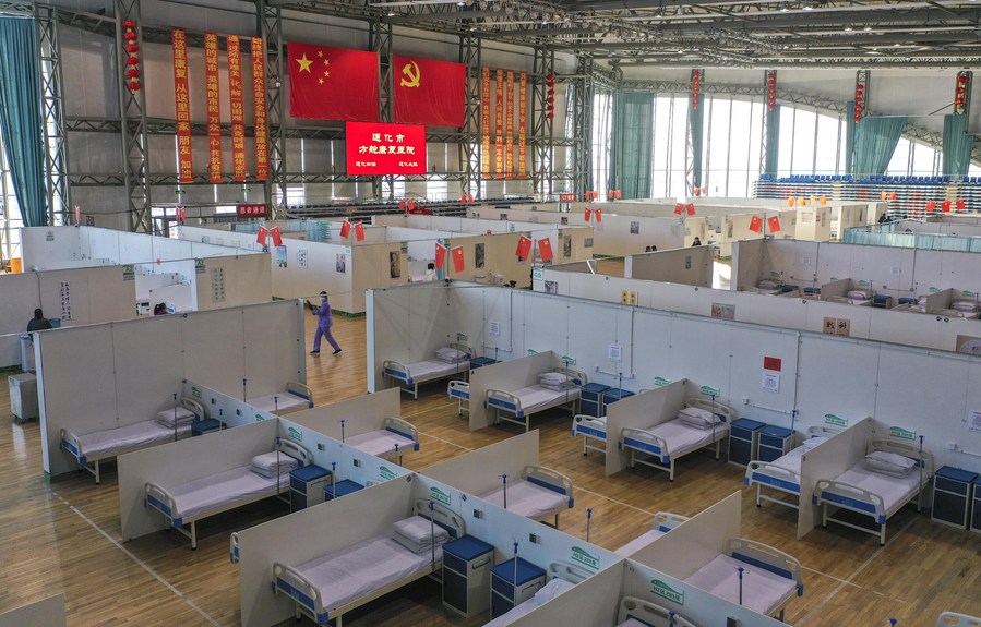 Aerial photo taken on Jan. 30, 2021 shows an interior view of a temporary hospital converted from a gymnasium in Tonghua, northeast China's Jilin Province. (Xinhua/Xu Chang)