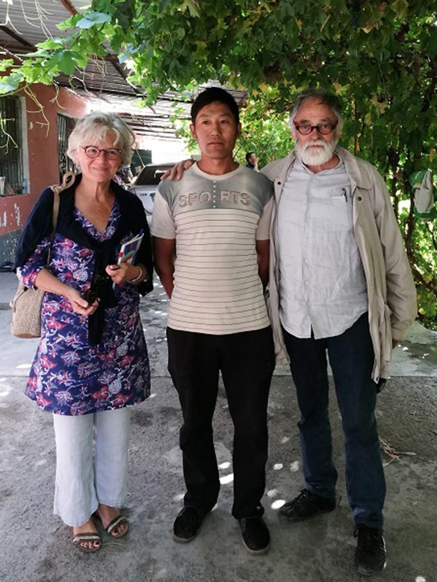 Maxime Vivas and his working partner poses with a local resident during a visit in Xinjiang. (Photo/Courtesy of Maxime Vivas)