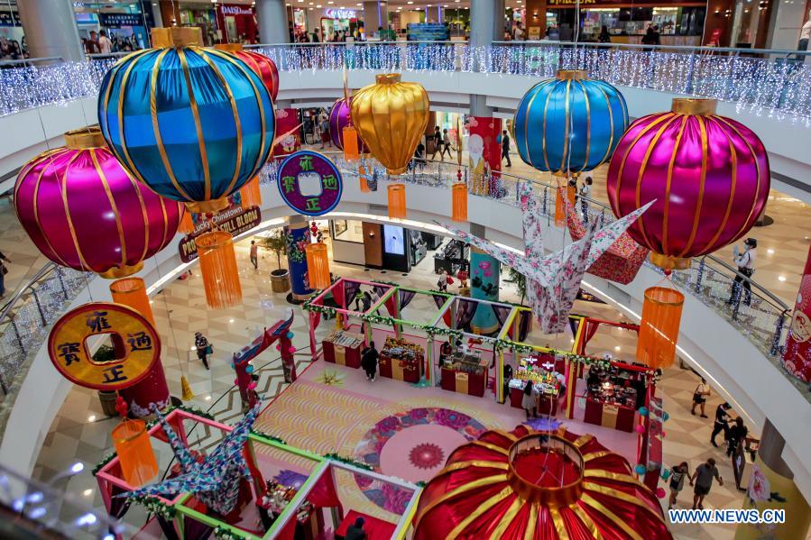 Chinese lanterns are placed for the upcoming Spring Festival, or the Chinese Lunar New Year, at a shopping mall in Manila, the Philippines, Feb. 7, 2021. (Xinhua/Rouelle Umali)