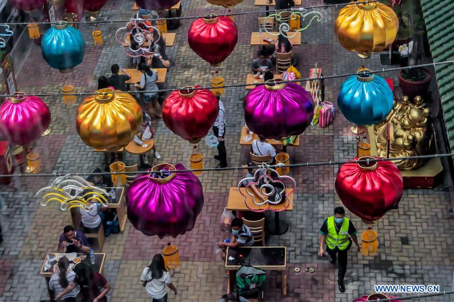 Chinese lanterns are placed for the upcoming Spring Festival, or the Chinese Lunar New Year, at a shopping street in Manila, the Philippines, Feb. 7, 2021. (Xinhua/Rouelle Umali)
