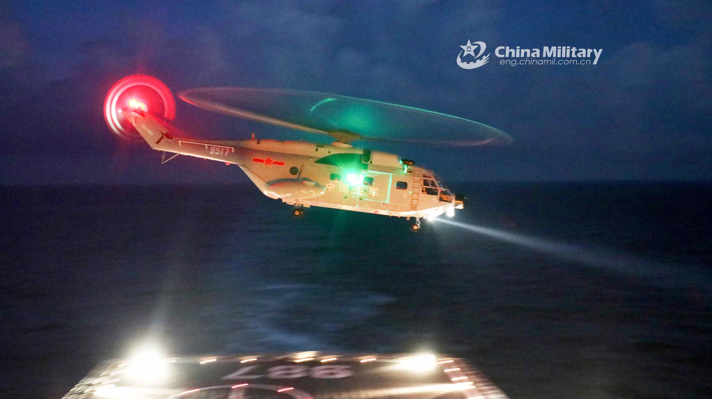 A ship-borne Z-8 transport helicopter attached to a landing ship flotilla with the navy under the PLA Southern Theater Command lifts off from the flight deck of the amphibious dock landing ship Wuzhishan (Hull 987) on January 26, 2021. The landing ship flotilla conducted a maritime coordinated training exercise on that day, including such training items as long-distance transport of landing troops and day-and-night helicopter take-off and landing, etc. (eng.chinamil.com.cn/Photo by Qiao Chenxi)