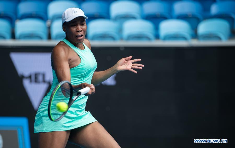 Venus Williams of the United States returns a shot during the women's singles first round match between Venus Williams of the United States and Kirsten Flipkens of Belgium at Australian Open in Melbourne Park, Melbourne, Australia on Feb. 8, 2021. (Photo by Hu Jingchen/Xinhua)