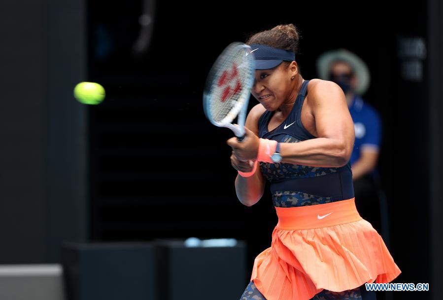 Osaka Naomi of Japan returns a shot during the women's singles first round match between Osaka Naomi of Japan and Anastasia Pavlyuchenkova of Russia at Australian Open in Melbourne Park, Melbourne, Australia on Feb. 8, 2021. (Xinhua/Bai Xuefei)