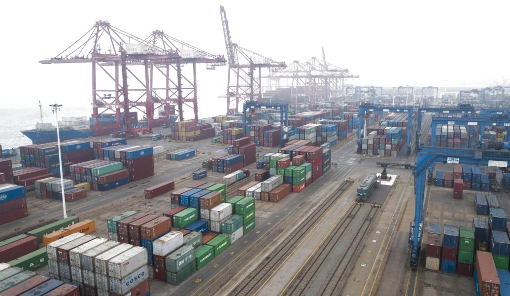 Aerial photo taken on Feb. 7, 2021 shows a view of the port in Lianyungang, east China's Jiangsu Province. (Xinhua/Wu Xinsheng)