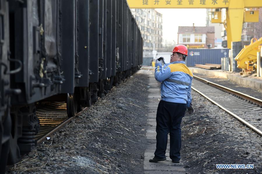 A staff member checks on the cargo of a "Qilu" freight train heading to Budapest at a railway station in Jinan, east China's Shandong Province, Feb. 8, 2021. In January 2021, 118 trips of "Qilu" freight train were made, up 45.7 percent year on year. The value of exports and imports via the train services was about 1.3 billion yuan (201.5 million U.S. dollars), up 205.2 percent year on year, according to the service operator Shandong High-speed Group. (Xinhua/Wang Kai)