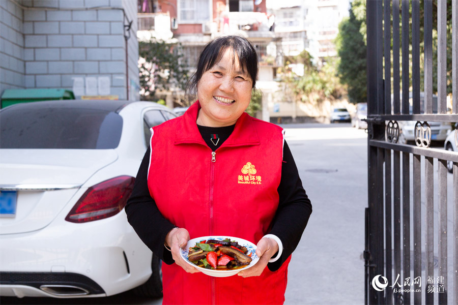 Tan Bingxiu, from Chenzhou in central China’s Hunan province, presents cured meat, a traditional dish from her hometown in Fuzhou, southeast China’s Fujian province. The 55-year-old woman, a garbage classification worker, decided to celebrate the upcoming Spring Festival with her family in Fuzhou this year. (People’s Daily Online/Jiao Yan)