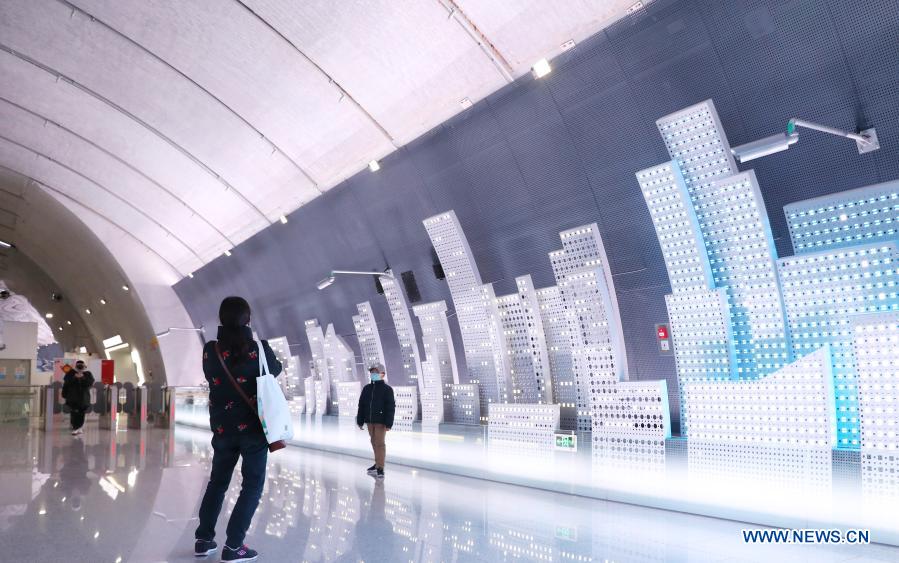 A woman takes photos at Wuzhong Road Station of Shanghai Subway Line 15 in Shanghai, east China, Feb. 9, 2021. The Shanghai Subway Line 15 started trial operation on Jan. 23. (Xinhua/Fang Zhe)