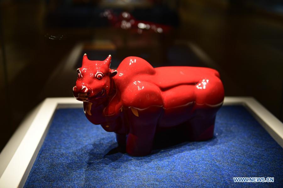 Photo taken on Feb. 9, 2021 shows an exhibit at an ox-themed art exhibition welcoming the Year of the Ox at Hainan Museum in Haikou, south China's Hainan Province. (Xinhua/Pu Xiaoxu)