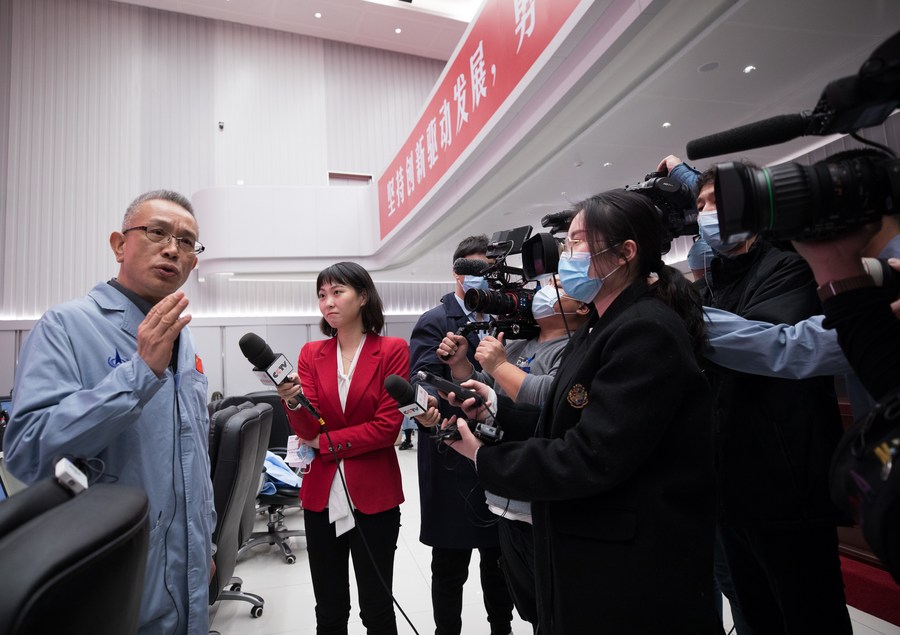 Zhang Rongqiao, chief designer of China's first Mars exploration mission, speaks in an interview at the Beijing Aerospace Control Center in Beijing, capital of China, Feb. 10, 2021. China's Tianwen-1 probe successfully entered the orbit around Mars on Wednesday after a nearly seven-month voyage from Earth. (Xinhua/Jin Liwang)