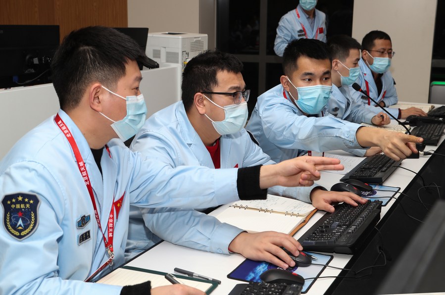 Technical personnel monitor China's Tianwen-1 probe at the Beijing Aerospace Control Center in Beijing, capital of China, Feb. 10, 2021. China's Tianwen-1 probe successfully entered the orbit around Mars on Wednesday after a nearly seven-month voyage from Earth. (CNSA/Handout via Xinhua)