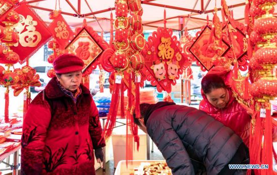 Customers purchase decorations for the upcoming Chinese Lunar New Year in Taohong Town of Longhui County in Shaoyang City, central China's Hunan Province, Feb. 10, 2021. (Photo by Fan Hui/Xinhua)
