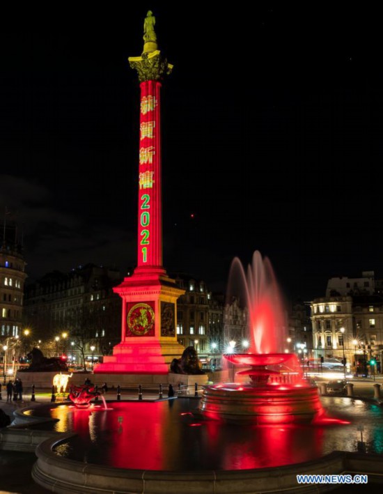 Photo taken on Feb. 10, 2021 shows the Nelson's Column and fountains illuminated in red to celebrate the forthcoming Chinese Lunar New Year, the Year of the Ox, at Trafalgar Square in London, Britain. (Xinhua/Han Yan)