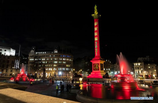 Photo taken on Feb. 10, 2021 shows the Nelson's Column and fountains illuminated in red to celebrate the forthcoming Chinese Lunar New Year, the Year of the Ox, at Trafalgar Square in London, Britain. (Xinhua/Han Yan)