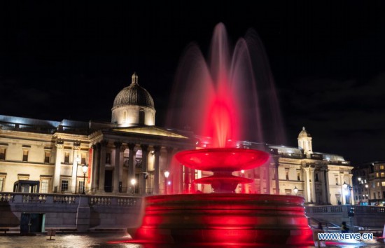 Photo taken on Feb. 10, 2021 shows the fountain illuminated in red to celebrate the forthcoming Chinese Lunar New Year, the Year of the Ox, at Trafalgar Square in London, Britain. (Xinhua/Han Yan)