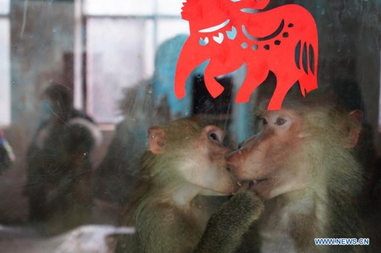 Two hamadryas baboons are seen at the Qinghai-Tibet Plateau Wild Zoo in Xining, northwest China's Qinghai Province, Feb. 10. 2021. The Qinghai-Tibet Plateau Wild Zoo on Wednesday organized an activity with the Qinghai Environmental Education Association to prepare "special dumplings" made of nuts, fruits and vegetables for the zoo animals, so that children interacted with small animals to celebrate the upcoming Chinese Lunar New Year. (Xinhua/Lan Xiang)