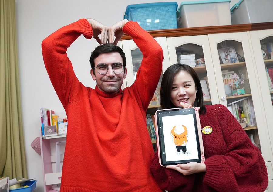 Li Jing (R), an illustrator in Wuhan, creates illustrations with Israeli blogger and entrepreneur Raz Galor in Wuhan, central China's Hubei Province, Feb. 6, 2021. (Xinhua/Xiong Qi)