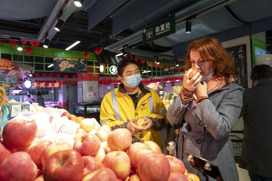 Wuhan local Zhong Weiwei (R) helps French doctor Philippe Klein shop for the Spring Festival in Wuhan, central China's Hubei Province, Feb. 3, 2021. (Xinhua/Xiong Qi)