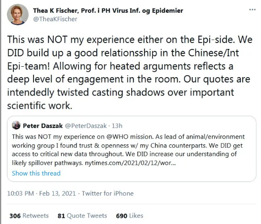 Another expert on the panel echoed his comments. Replying to the thread, Thea K?lsen Fischer, wrote, "this was NOT my experience either on the Epi-side. We DID build up a good relationship in the Chinese and International Epi-team! Allowing for heated arguments reflects a deep level of engagement in the room. Our quotes are intendedly twisted casting shadows over important scientific work."