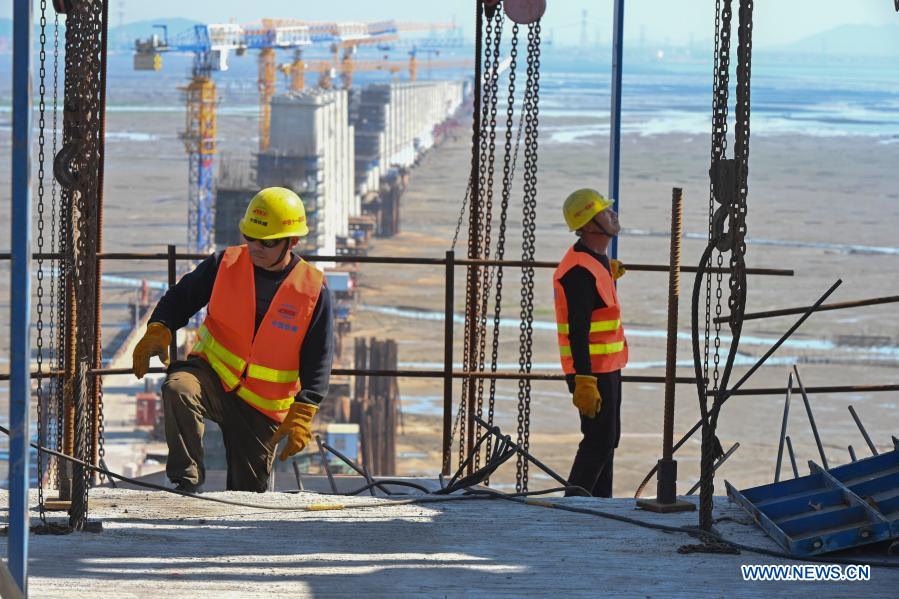 Laborers work at the construction site of Meizhou Bay cross-sea bridge of the Fuzhou-Xiamen high-speed railway in southeast China's Fujian Province, Feb. 15, 2021. Some 500 laborers still work at the construction site of the bridge during the Chinese Lunar New Year. The 14.7-km-long bridge is part of the province's Fuzhou-Xiamen high-speed railway, the first cross-sea high-speed railway in China, which is expected to be put into operation in 2022. (Xinhua/Song Weiwei)