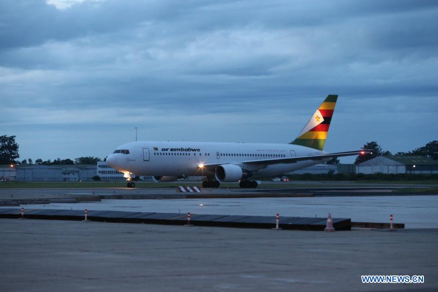An Air Zimbabwe charter plane carrying the COVID-19 vaccines donated by China arrives at Robert Mugabe International Airport in Harare, Zimbabwe, on Feb. 15, 2021. A batch of COVID-19 vaccines donated by China arrived in Robert Mugabe International Airport in Zimbabwe's capital here on early Monday morning. The 200,000 doses of Sinopharm vaccines are the first batch that Zimbabwe has received as it steps up efforts to curb the spread of the COVID-19 pandemic. (Photo by Chen Yaqin/Xinhua)