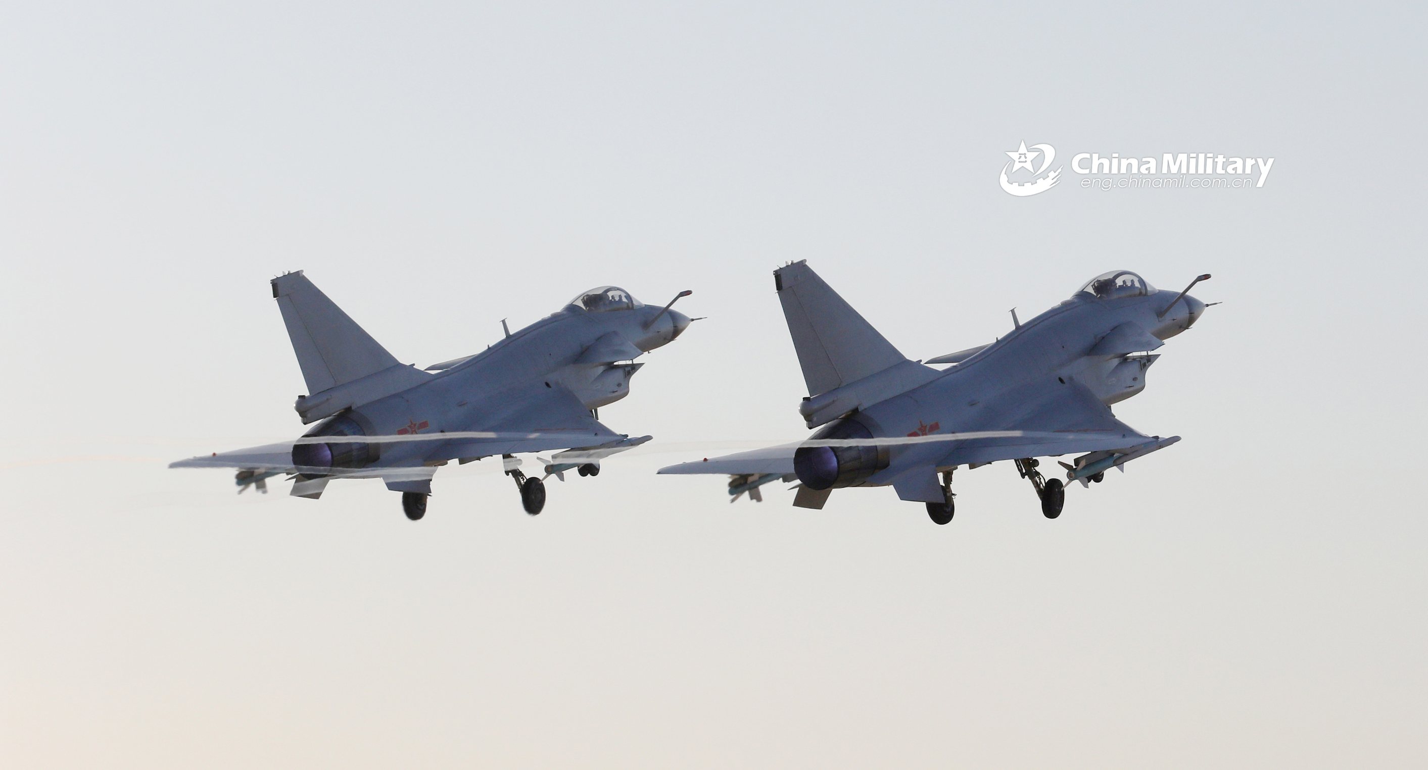 Two J-10 fighter jets attached to an aviation brigade of the air force under the PLA Southern Theater Command coordinated with each other as they take off for actual aerial combat training on February 1, 2021. (eng.chinamil.com.cn/Photo by Gu Haodong)