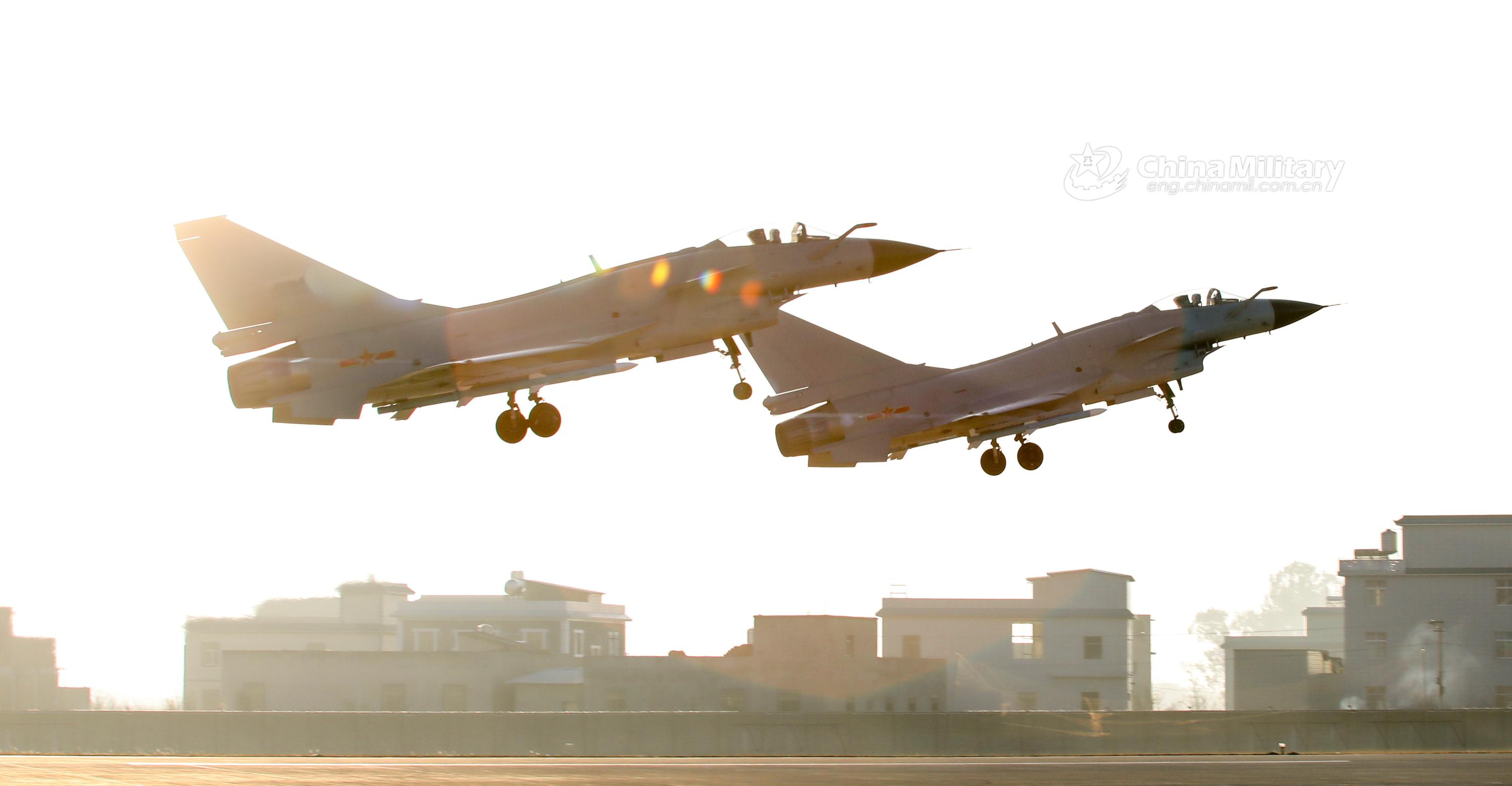 Two J-10 fighter jets attached to an aviation brigade of the air force under the PLA Southern Theater Command coordinated with each other as they take off for actual aerial combat training on February 1, 2021. (eng.chinamil.com.cn/Photo by Gu Haodong)