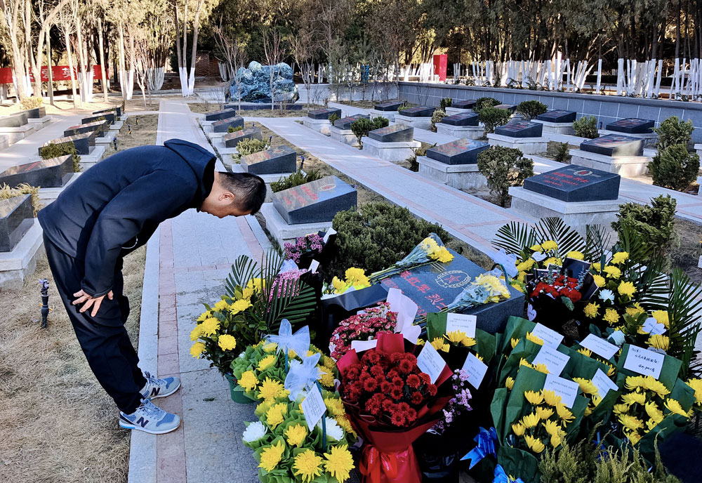 Guo Huaide pays respects in Lanzhou, Gansu province, on Saturday to Chen Hongjun, one of the four martyrs who died during the border clash with India in June. Chen was a college classmate of Guo. WEI DEZHAN/FOR CHINA DAILY