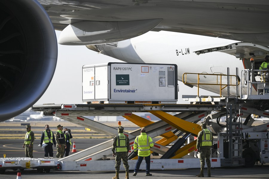 Staff members unload a temperature-controlled cargo container with COVID-19 vaccines from Chinese company Sinovac inside from a plane at the airport in Mexico City, Mexico, Feb. 20, 2021. (Xinhua/Xin Yuewei)
