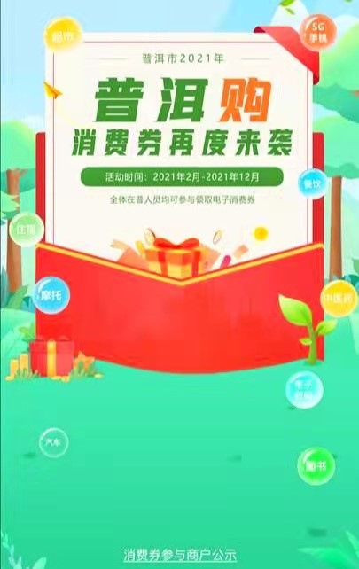 A total of approx. 305,600 "Pu'er purchase vouchers" were issued this time, including 9 types of electronic consumer vouchers for automobiles, supermarkets, catering, household appliances, and 5G mobile phones, as well as offline refined oil vouchers and "love" vouchers.