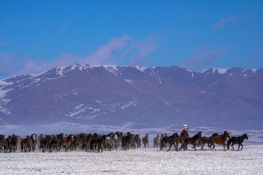 Horses run at a horse field in Zhaosu County, Kazak Autonomous Prefecture of Ili, northwest China's Xinjiang Uygur Autonomous Region, Dec. 31, 2020. (Xinhua/Bai Zhiqiang)