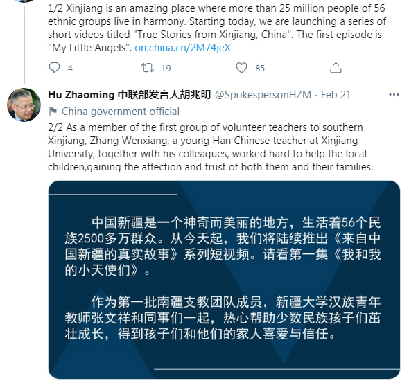 "Starting today, we are launching a series of short videos titled 'True Stories from Xinjiang, China,'" Hu wrote on his Twitter page on Sunday, adding that the first episode of the series is titled "My Little Angels."