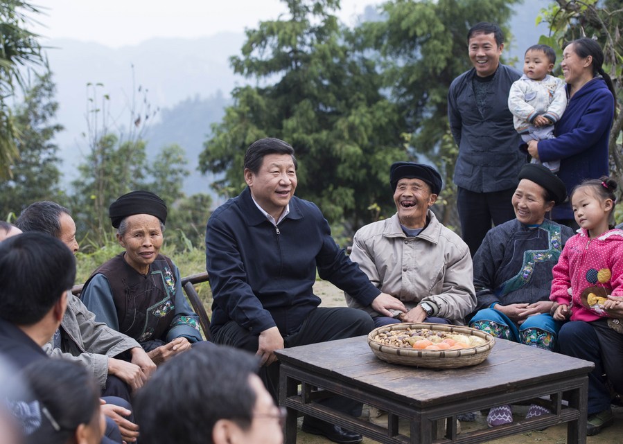Chinese President Xi Jinping (C), also general secretary of the Communist Party of China (CPC) Central Committee and chairman of Central Military Commission, talks with local villagers and cadres at Shibadong Village in Paibi Township of Huayuan County in the Tujia-Miao Autonomous Prefecture of Xiangxi, central China's Hunan Province, Nov. 3, 2013. (Xinhua/Wang Ye)