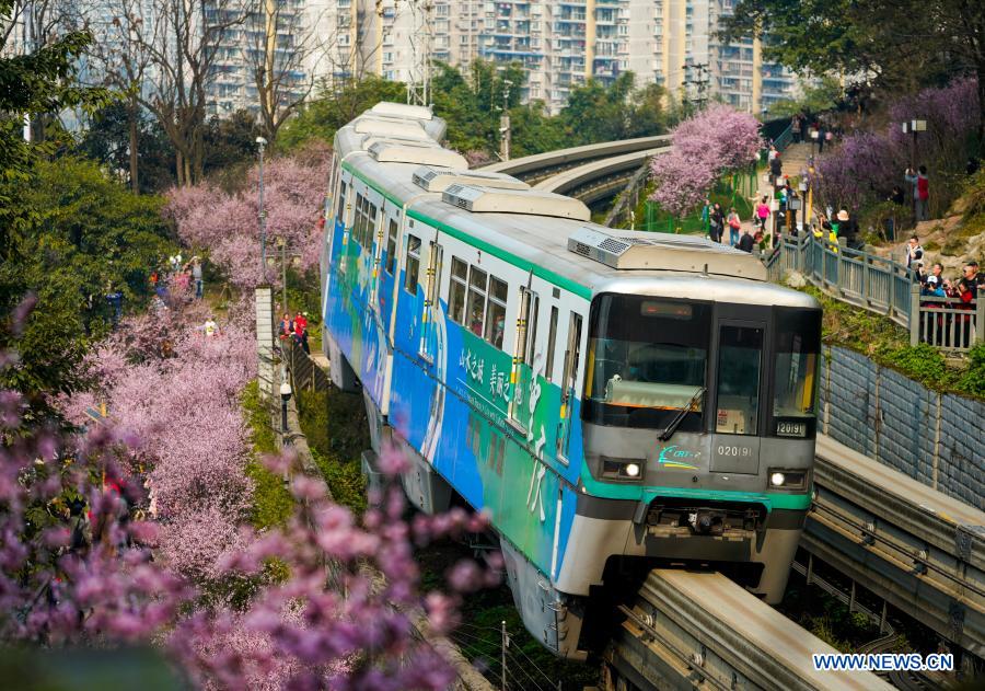 A monorail train runs past blooming flowers at Fotuguan section of Chongqing metro line 2 in southwest China's Chongqing Municipality, Feb. 23, 2021. (Xinhua/Liu Chan)