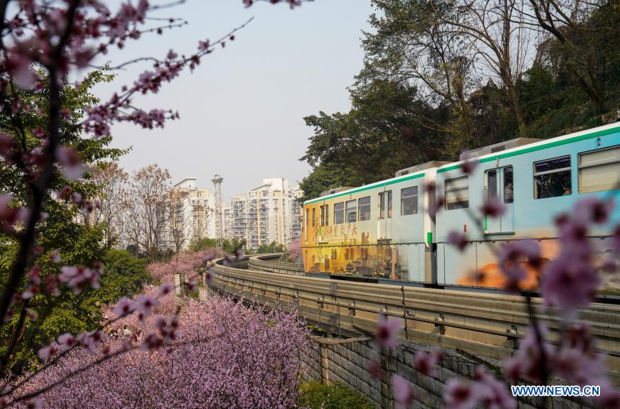 A monorail train runs past blooming flowers at Fotuguan section of Chongqing metro line 2 in southwest China's Chongqing Municipality, Feb. 23, 2021. (Xinhua/Liu Chan)