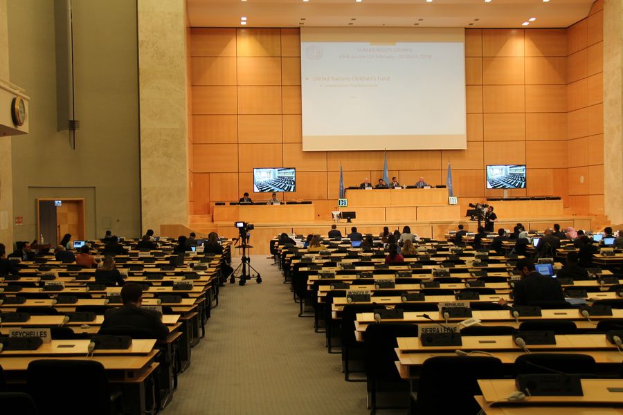 Photo taken on March 12, 2020 shows the United Nations Human Rights Council conducting Universal Periodic Review during its 43rd session in Geneva, Switzerland.(Xinhua/Nie Xiaoyang)
