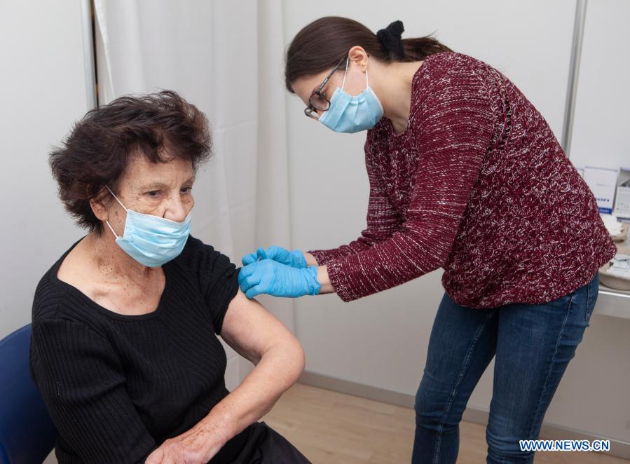A woman receives a shot of the COVID-19 vaccine in Nicosia, Cyprus, Feb. 24, 2021. Cyprus' COVID-19 vaccination campaign is picking up speed as larger vaccine shipments were due to be delivered on Wednesday under the European Union's joint vaccine procurement scheme, a Health Ministry official said. (Photo by George Christophorou/Xinhua)