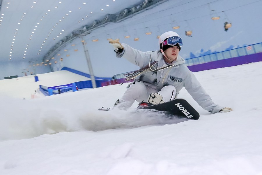 A man is snowboarding at Harbin Sunac Snow World, China on July 27, 2020. (Xinhua/Wang Junbao)