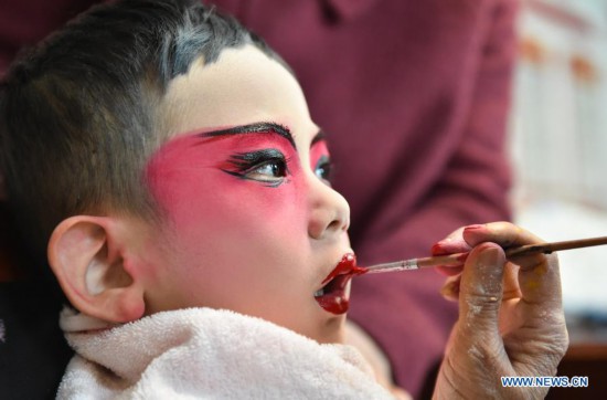 A child wears make-up for the Ekou Naoge performance in Haojie Village of Daixian County, north China's Shanxi Province, Feb. 23, 2021. 73-year-old Hao is an inheritor of the national intangible cultural heritage Ekou Naoge performance, an art form integrating dancing, music, art with acrobatics. It is a local tradition to perform Ekou Naoge during the celebration of the Lantern Festival. This year, Hao decided to present an online performance for the festival at the suggestion of his son and grandson. (Xinhua/Chai Ting)