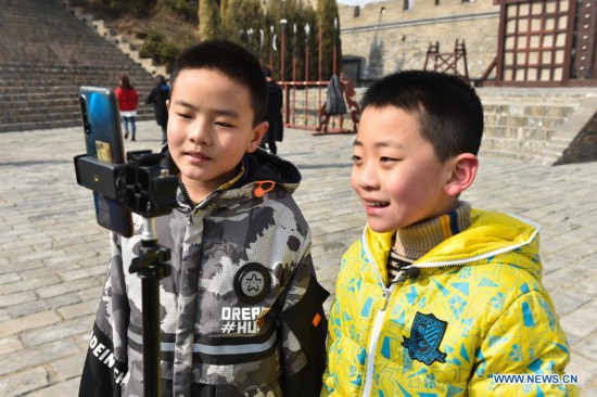 Hao Laixi's grandson Hao Jincheng (R) introduces Ekou Naoge performance via live streaming at a scenic spot in Daixian County, north China's Shanxi Province, Feb. 23, 2021. 73-year-old Hao is an inheritor of the national intangible cultural heritage Ekou Naoge performance, an art form integrating dancing, music, art with acrobatics. It is a local tradition to perform Ekou Naoge during the celebration of the Lantern Festival. This year, Hao decided to present an online performance for the festival at the suggestion of his son and grandson. (Xinhua/Chai Ting)