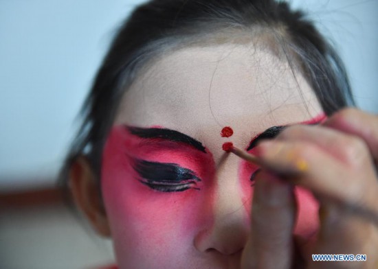 A child wears make-up for the Ekou Naoge performance in Haojie Village of Daixian County, north China's Shanxi Province, Feb. 23, 2021. 73-year-old Hao is an inheritor of the national intangible cultural heritage Ekou Naoge performance, an art form integrating dancing, music, art with acrobatics. It is a local tradition to perform Ekou Naoge during the celebration of the Lantern Festival. This year, Hao decided to present an online performance for the festival at the suggestion of his son and grandson. (Xinhua/Chai Ting)