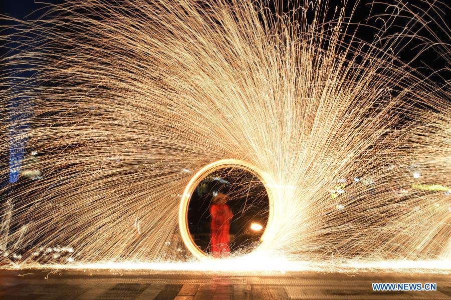 People enjoy "iron flowers," a folk art performance of throwing molten iron to create fireworks, in Changsha, capital of central China's Hunan Province, Feb. 26, 2021. Various activities were held across China to celebrate the Lantern Festival on Friday, the 15th day of the first month of the Chinese lunar calendar. (Xinhua/Chen Zhenhai)
