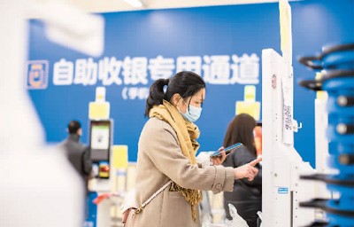 A citizen uses a self-checkout machine in a Walmart supermarket on Fengtian road, Shapingba district, southwest China's Chongqing municipality. (Photo/People's Daily Online)