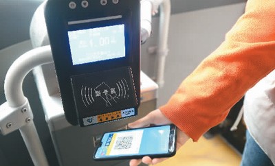 A passenger scans a QR code to pay for a bus ticket. (Photo/Zhang Tao)