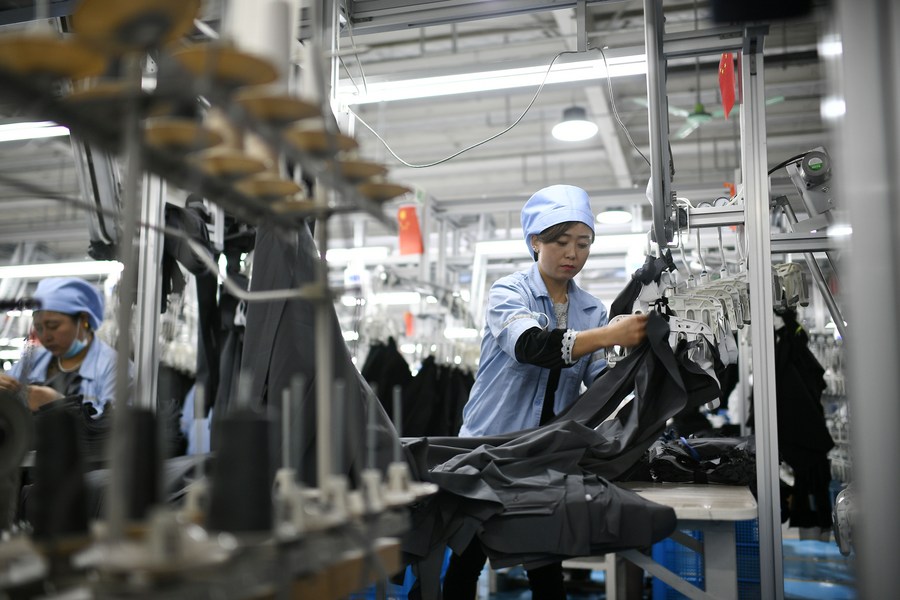 Female employees make garments in a poverty alleviation workshop in Tongxin County, northwest China's Ningxia Hui Autonomous Region, Feb. 24, 2021. (Xinhua/Wang Peng)