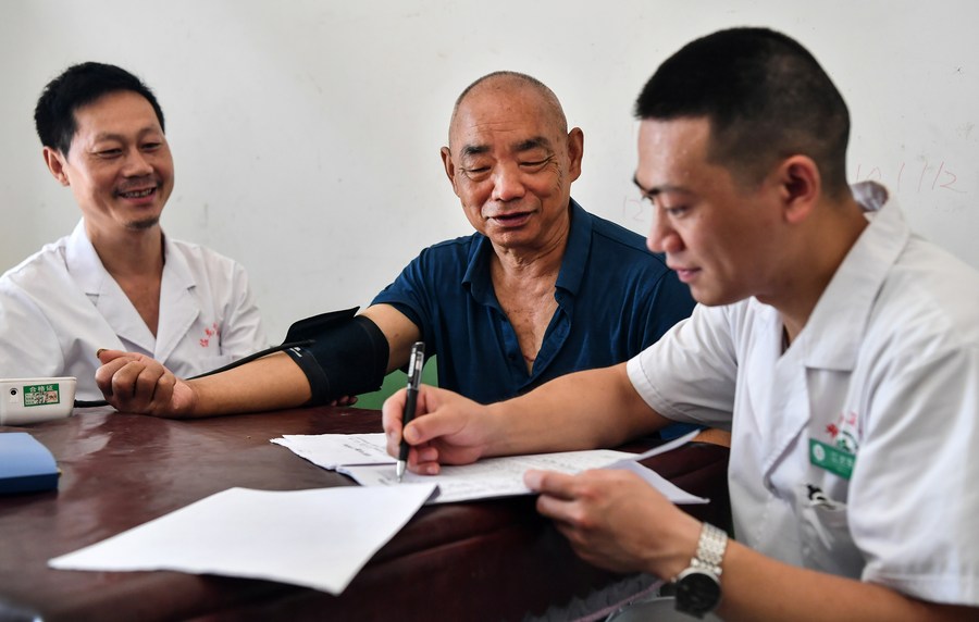 Contracted family doctors from Zuolong Township Central Hospital visit a villager with chronic diseases in Zuolong Village, Zuolong Township of Langao County, northwest China's Shaanxi Province, July 30, 2020. (Xinhua/Liu Xiao)